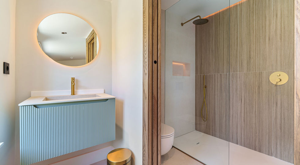 Inside, the villa blends soft minimalism with warm natural tones, featuring a fully equipped kitchen with a central island, a generous dining area, and a cozy living space with fireplace and custom cabinetry. The primary suite opens directly onto the pool terrace and includes a luxurious bathroom with freestanding tub and walk-in shower.